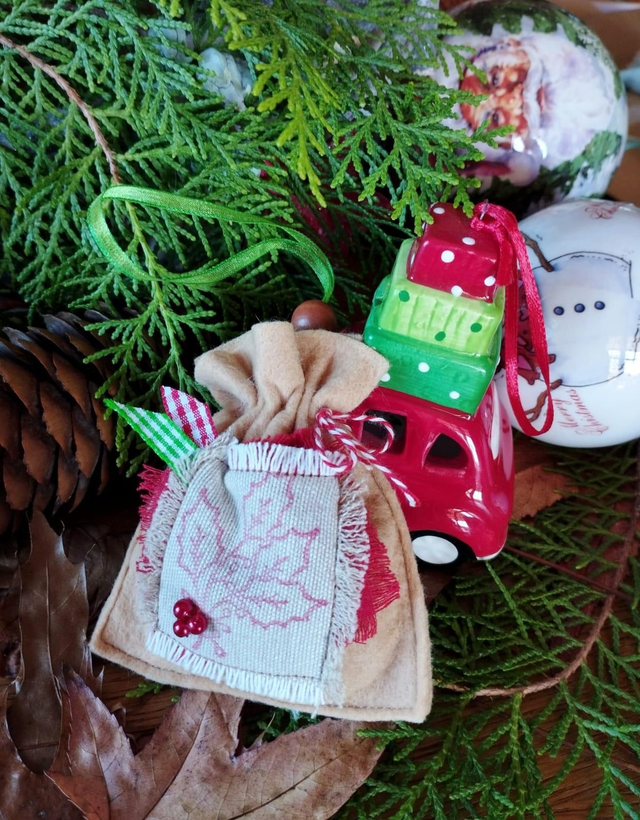 La mini hotte de Noël, nichée dans les branches du sapin, offre douceur et chaleur à votre déco de fêtes.