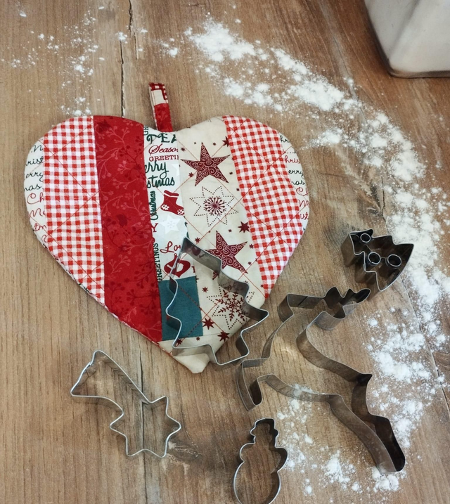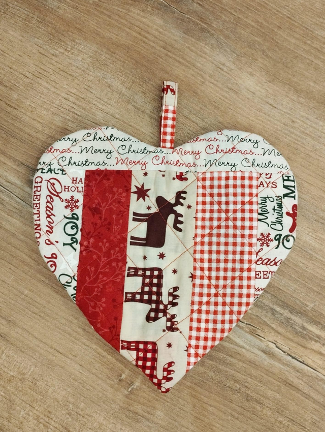La manique de cuisine en forme de coeur, cousue aux motifs vifs et joyeux de l'hiver.